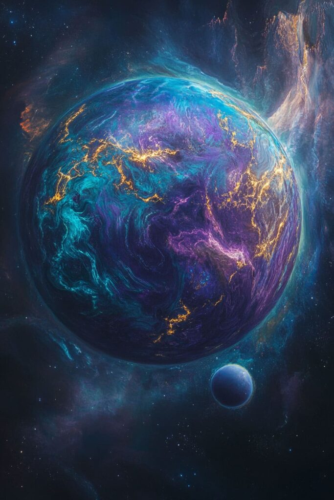 From the vastness of space, Astaris glows like a jewel suspended in the void. Its surface is a mesmerizing swirl of deep violet oceans, glowing turquoise forests, and jagged black mountain ranges that glint with golden veins of molten energy. Wisps of shimmering auroras dance across the atmosphere, casting a faint halo of emerald and crimson light around the planet. The shadows of its twin moons occasionally stretch across its surface, adding an air of mystery to its already otherworldly beauty. Even from orbit, the planet pulses faintly, as if alive, its bioluminescent energy a beacon in the dark reaches of the galaxy.