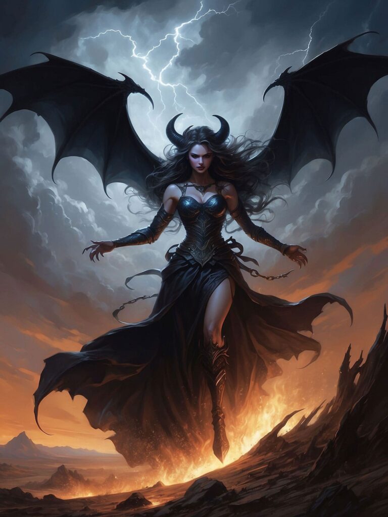 Velthara, the Obsidian Queen, is a figure of dark magnificence and fearsome power. Her presence is commanding, with sharp horns that curve like the crescent moons of Astaris, framing her wild cascade of midnight-black hair. Her piercing gaze burns with an emerald glow, betraying both ancient wisdom and simmering rage. Velthara's bat-like wings stretch wide, their leathery expanse rippling as if alive with shadowy whispers, and her armored bodice gleams like polished onyx, exuding strength and regality.